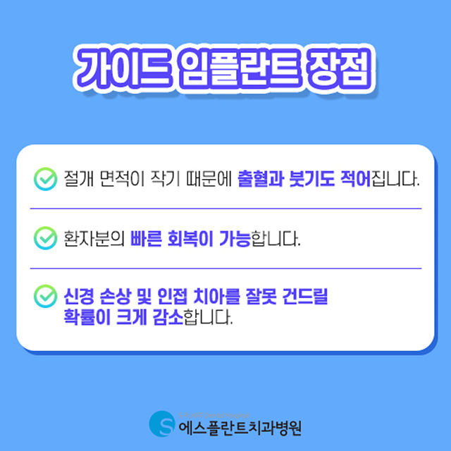 가이드 임플란트의 장점은 안전성 외에도 다양합니다. 우선 절개가 아니라 드릴링 방식으로 진행하기 때문에 출혈, 붓기, 통증 등이 모두 감소됩니다. 이 점은 당뇨 및 전신질환을 앓고 있는 환자분들에게도 매우 유용하게 작용합니다. 또한 후유증이 적다는 것은 회복 속도가 빠르다는 것을 뜻하기도 합니다. 즉, 가이드 임플란트의 장점은 1. 안전성 보장 2. 후유증 감소 3. 빠른 회복 가능 세 가지로 볼 수 있습니다.